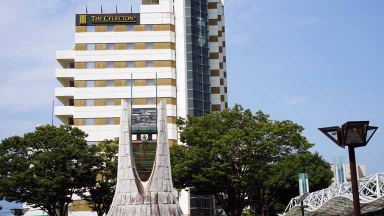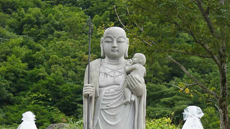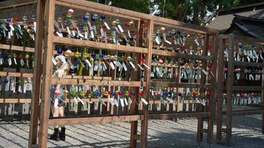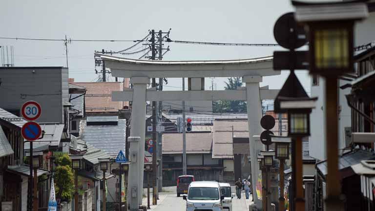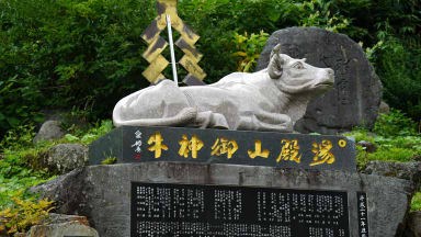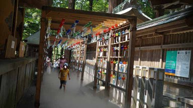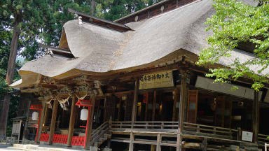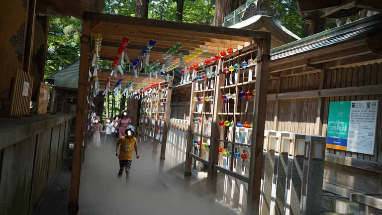 東北の伊勢とも言われ、和歌山県の熊野三山、長野県の熊野皇大神社とともに日本三熊野の一つに数えられる熊野大社。縁結びで有名。参道の入口には大鳥居、参道には樹齢850年の大イチョウも今力強くそびえ立っていた。46段の石段をのぼると現れる、どっしりした風格のある茅葺きの本殿。風鈴の小径に足元シャワーが涼しかった。本殿裏側の「三羽のうさぎ」の彫刻をすべて見つけると願いが叶うとか。ガイドさんにヒントは貰ったがハッキリと認識は難しい。