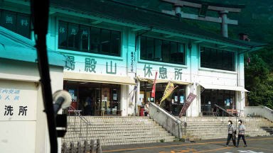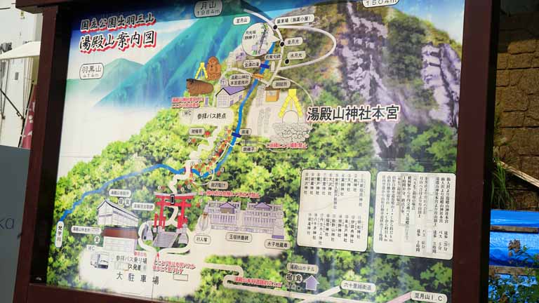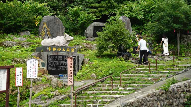 12時丁度にバスは出発し、湯殿山に向かう。1時間半ほどで着くとのこと。湯殿山自体が神であり社殿は無く、麓にバスは止まって、そこからはマイクロバスで山頂に向かう。かみのやま温泉ICから東北中央道に戻って、山形自動車道を経由し西川、月山ICで高速を降りて仙人沢駐車場でバスは止まる。1時40分のシャトルバスで山頂まで約5分の道のり。そこから約5分の歩行になる。ここから先は写真撮影が禁止されており、湯殿神社に参拝。ここは出羽三山未来を表すスポットで、裸足になって、温泉水の流れる大岩群を登って、さら二礼二拍手一拝をする場所がある。