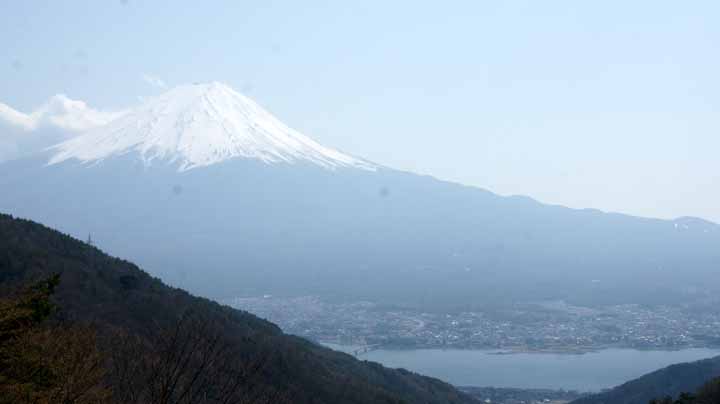 腹ごしらえをして愈々これから河口湖周辺の探訪が始まる。まずは御坂峠まで5kmほどの山道をたんたんと登る。2時前に峠に到着して、高台からの富士山を眺める。太宰治が有名な句(詩?)「富士には月見草がよく似合う」と詠んだ地である。彼はこの峠にある「天下茶屋」に泊まり込んで筆を運んだという。