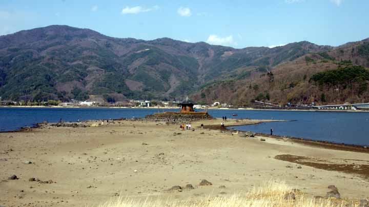 15:40、八木沢公園のパーキングに停めて、鵜の島の六角堂まで歩いてきた。本来は六角堂は湖上に浮かんでいるのを岸から眺めるのだが、なぜか今年に入ってから湖面の低下が続いているせいで歩いて行ける。