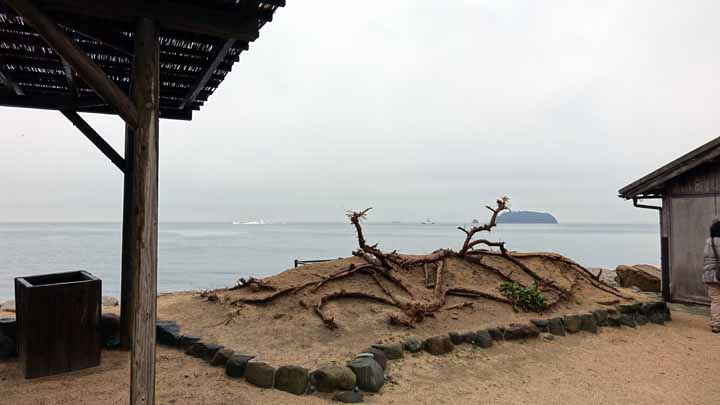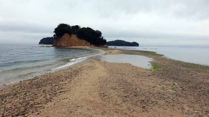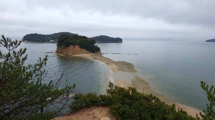 11時35分の土庄港行きのフェリーに1時間揺られ雨降る小豆島にやっと到着できた。今夜宿泊予定の「ホテルグリーンプラザ小豆島」に電話を入れ、土庄港観光センタ−まで迎えに来てもらった。荷物を預け、ホテルで借りたレンタカーで島内のミニミニ観光に出かけた。車種はホンダのフィット。最初の目的地はエンジェルロード。引き潮時には島への砂浜の道があらわれて、徒歩で島まで行けるようになっている。今日は干潮が11時17分、午後2時まではエンジェルロードが見えるとのこと。1時40分なのでぎりぎりで間に合った。