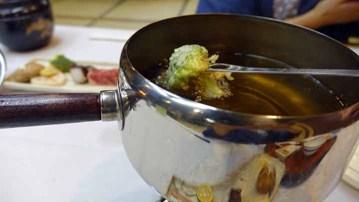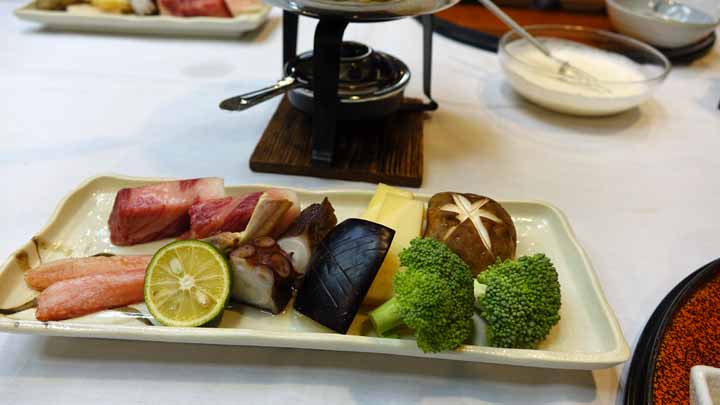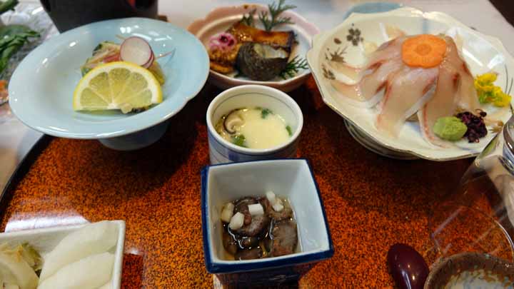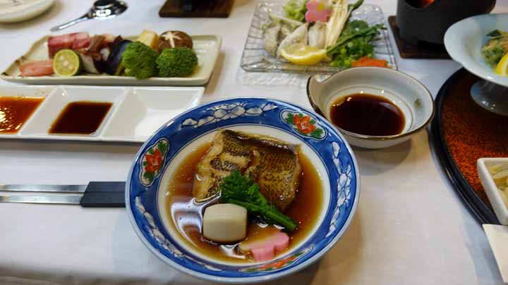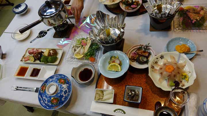 午後7時から夕食。四国最後の夕食は鯛の刺身、素麺、ふぐちり、鰈の煮つけ、に加え魚介牛肉野菜のオイルフォンデュなどいろいろ豪華な食事で満腹した。
