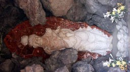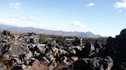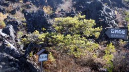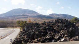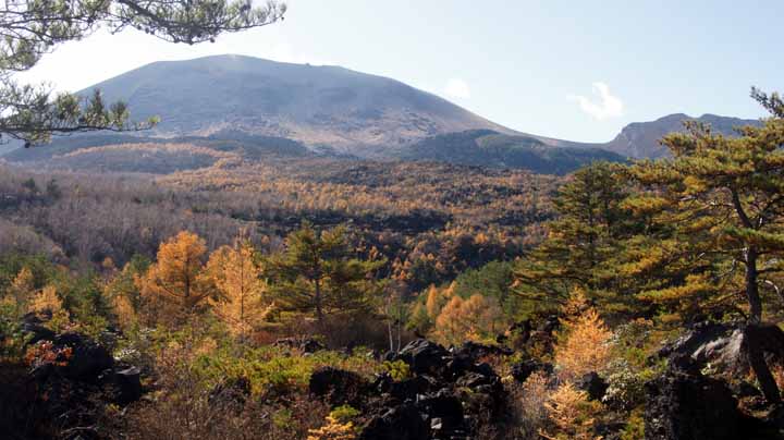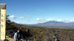 その後、40分ほどロマンチック街道を走り、浅間山の噴火でできた溶岩の美を集めた鬼押し出し園に入園。ここでも5kmほどを枯れた高山植物を脇に見ながらひたすら歩いた。どこからも美しい山姿をしている浅間山がみえる。浅間山(2568m)と隣の黒斑山(2405m)がなす形が観音様の値姿にみえることから寝観音ともよばれているらしい。