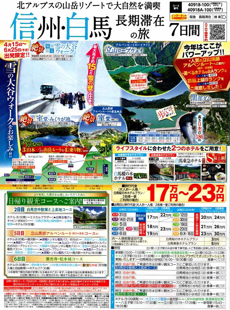 - 終日自由行動 または「白馬空中散策と上高地コース」以下行程 バス走行距離195Km