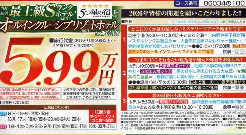 ミステリーツアーと言っているがパンフレットの写真をgoogleレンズで見ると、1泊目のホテルは大山 のふもとにある「メルキュール鳥取大山リゾート&スパ」で以前は「ロイヤルホテル大山」として知られていた。2泊目ははわい温泉「望湖楼」だろう。山陰八景に数えられる美しい東郷湖の湖上に浮かぶようにそびえる優雅な宿で湖上露天風呂で有名。