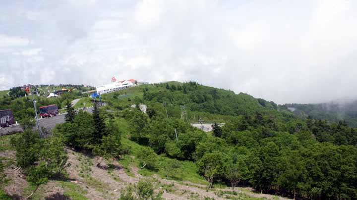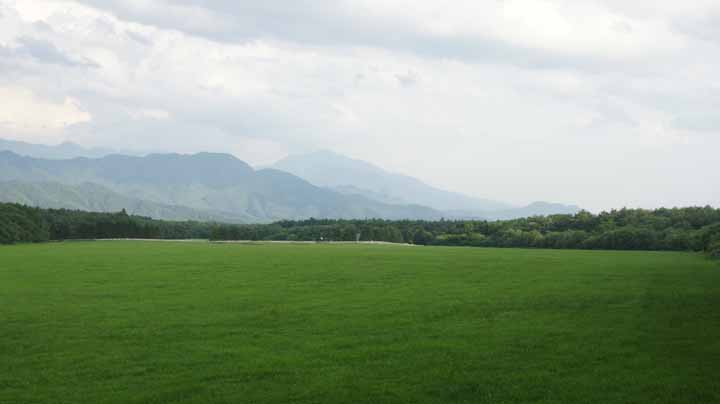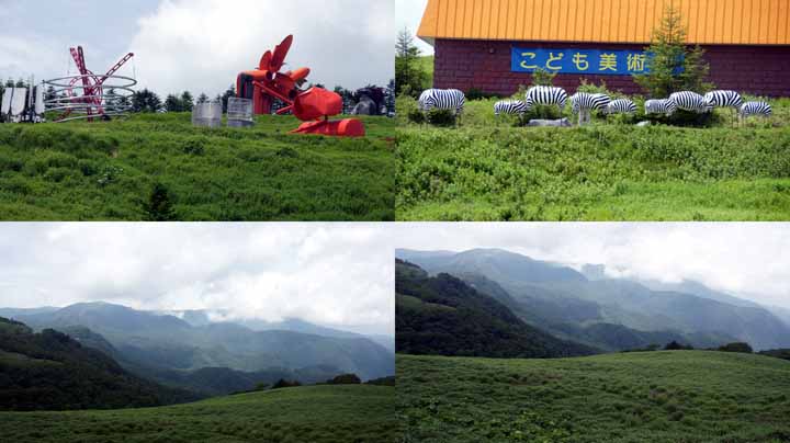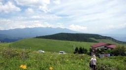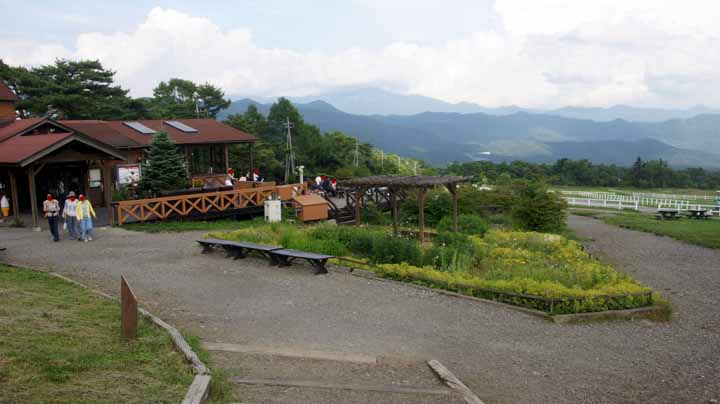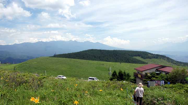 09:50に宿をでて、美が原に向かう。出発地は標高1500mだが向かう先は500m高い標高1950m。到着したのは10:50で自宅からの走行距離は300kmに達していた。20分ばかり周りの山々や草原などを展望してみた。雨は降っていなかったが、雲や靄がかかり、天気の良い日に見える浅間山や富士山が残念ながらみえない。しかし気温は22度と涼しくて爽快だ。