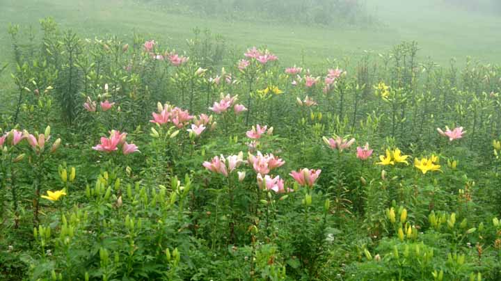 チェックアウトする頃から涼しかったが、車で500mほど行き始めると濃い靄がかかってきた。最初はスモールライト+フォッグランプにしていたが、それでは追いつかず、通常ライトを点灯した。早く帰らないといけないので、小淵沢にある富士見高原「ゆりの丘」で百合を観に行こうと決めた。濃霧のさなか、午前11:00前に富士見高原に到着できた。心配していた濃霧もゆりの丘200m手前ですっきり嘘のように消えた。