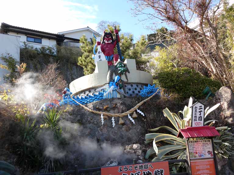 11時前に別府駅にバスは到着し、今日のメインイベント「バスで地獄巡り観光」は2時出発なので3時間も時間がある。予め衣料品など事前に持っていっておいても良いものは郵パックでホテルに送っておいた。時間があるので、dachs飼主のリュックとツレアイのバッグなどさらに徒歩10分程度の泊まるホテルに持ち込んで駅に戻った。別府駅前には別府を温泉で著名にした「油屋惣八銅像」が著名だ。空港には足湯があったが、ここ別府駅前では「手湯」があった。お昼になったので別府駅から北浜方面にランチに向かってどこだというあてどもなくぶらぶらと散策した。商店街にはカラーマンホールが幾種類もあった。15分ほど歩いてカウンター式の(別府ラーメン)という店名のラーメン屋に入り実食した。旨かった。細麺の九州の特長を出しつつ、和風だしで決めた味付けはdachs飼主の好みにとてもあった。セットでお薦めのリュウキュウ付きがあったのでそれもオーダーした。リュウキュウとは鯖サーモン鯛刺身などを小分けにし、カボスでしめた小料理でこれも味わい深かった。