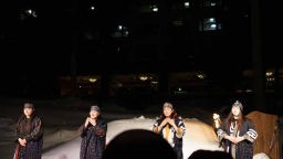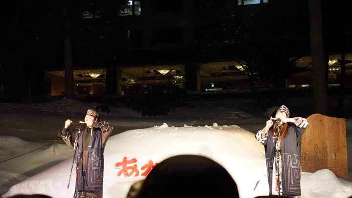 その後、阿寒湖にでてアイヌの方たちのミニ劇を見た後で冬花火を観賞。寒かったがとても美しかった。