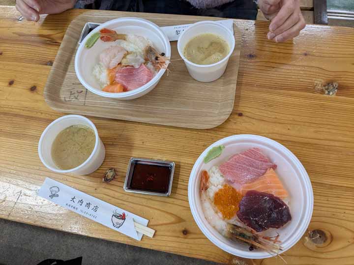 朝飯が徒歩5分の和商市場まで向かうので朝は前準備に忙しかった。市場オープンが8時、バスがホテルを出発するのが9時15分と言われていたが、十分時間があった。市場では普段食べない新鮮な海鮮魚介から好きなネタを選んで丼に乗せる海鮮丼。めったに食べることのない鯨も美味かった。1500円分のネタクーポンをもらっていたが300円ほど超過したが悔いは無い。