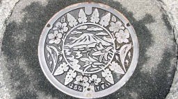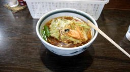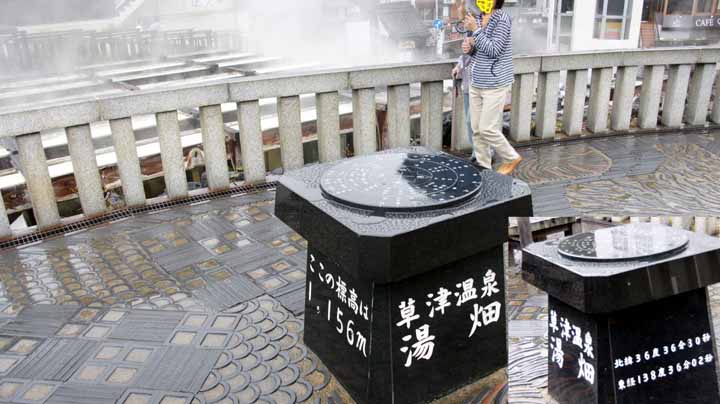 榛名湖には12:00に到着。風も無く絶好の陽気だ。湖自体は小さいが、榛名富士と呼ばれる山が湖畔に映えて美しい。湖畔にある昼ごはん処は、土産物屋併設の食堂ばかりで立ち食い風のカレーや山菜そばしかなく、せっかく群馬まできて・・・ と思い、本日最終到着地の草津までさらに走った。草津は群馬県吾妻郡にあるが、同じ吾妻郡にダム建設中止で有名になった八ツ場村があったのでマンホールだけ撮影。草津手前で50Km以下で『草津良いとこ・・・』の一番が先ほどの湖畔の歌と同様、道端から流れてきた。「道の駅草津」に到着したが、まともな食事が出来ない。草津には意外に早い到着で午後1時半、まだチェックインには30分の余裕があったので温泉街で昼食。眺庭庵「益成屋」で高原野菜のかき揚げ天麩羅そばを食べた。