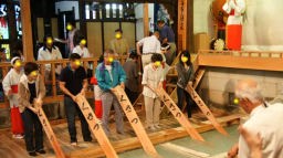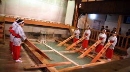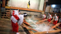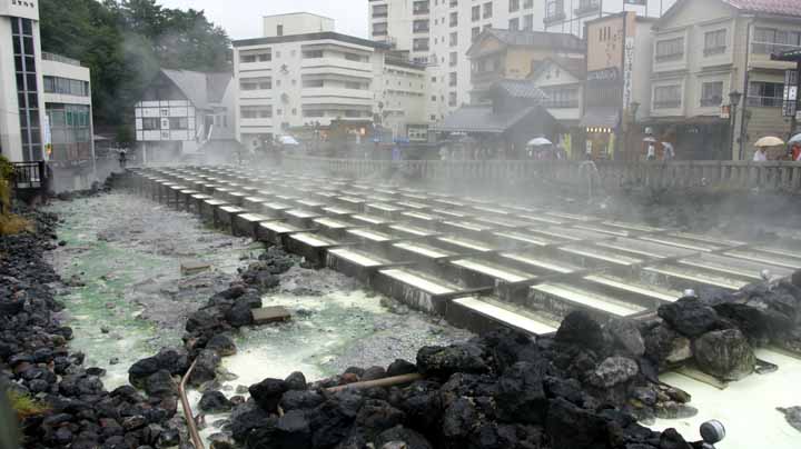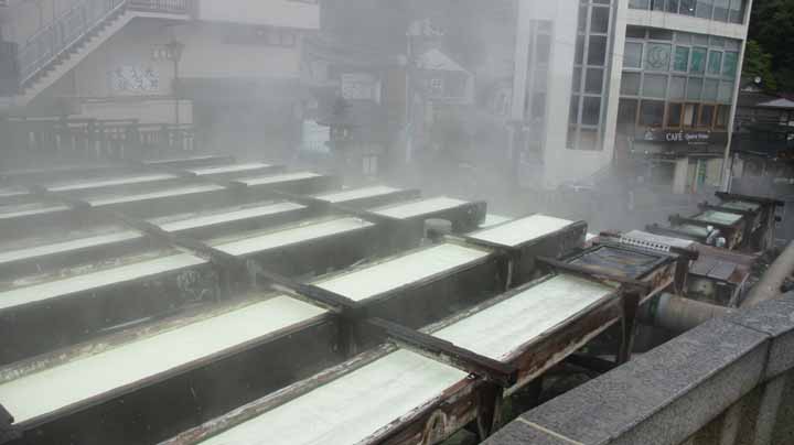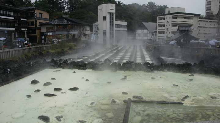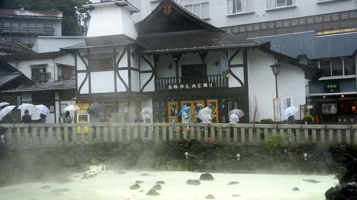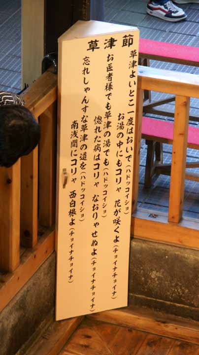 - 草津に限らず、入浴時に温泉が熱いと、ついつい水で埋める人がいるが、これは愚の骨頂。熱い草津の温泉用に開発されたのが、「湯もみ」だ。長い板で温泉をかきまわし、効能はそのままに湯をさます。dachs飼主一行は湯畑前の「熱の湯」でショーとして見物してきた。