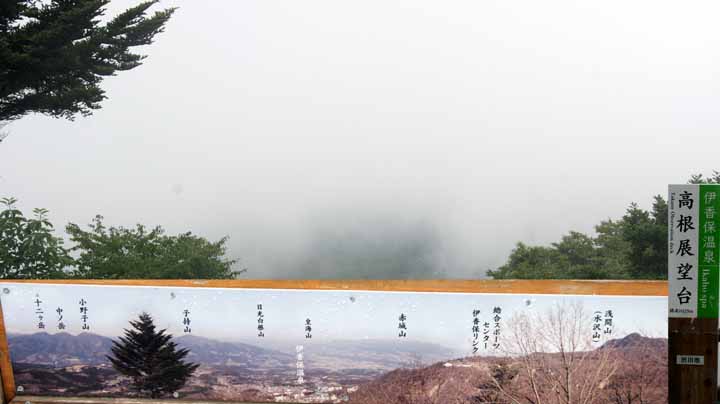 渋川市伊香保の温泉街を車で通ったが、坂道・階段・土産物店などそれほど目新しいもの無くすり抜けた。伊香保温泉の峠の上に「高根展望台」があり、普段なら浅間山・赤城山、遠くには谷川岳が臨めるらしいが、今日はモヤが深くかかり、全く見通しが利かない。