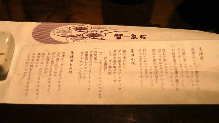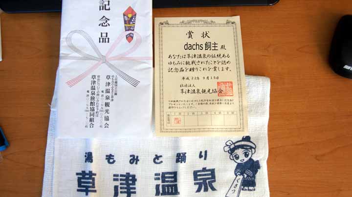 今夜の宿ホテル高松に到着したのが午後2時ちょうど。ホテル到着と同時に雨が降りだす。草津は3人とも初めてで、湯畑散策では皆で大感激。湯畑はまさに畑のようで1分間にドラム缶25本分のお湯が流れるそうだ。草津には共同浴場・内湯めぐり、西の川原公園など見所は多いが、雨降りもそうだが愛子様がご高齢でもあるので、湯畑を3周もあいあい傘して廻った。湯畑の真ん前で「湯もみ踊り」が実演されていたので早速その小屋に入った。 湯もみとは高温の温泉を湯もみ板で源泉をこねる作業で、dachs飼主も挙手をして「草津良いトコ」に合わせて湯もみに挑戦してみた。音楽に合わせて何とか湯もみ板をこねくり回し最後まで演技を終えることができ、お陰でタオルと賞状を頂戴できた。