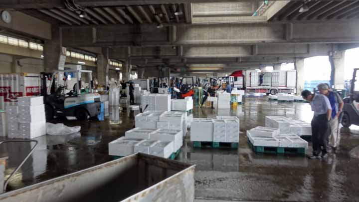 鹿児島で水揚げされたカツオなどが白い発泡スチロール箱に美しくパッケージ化されていた。市場も昔より清潔なので、魚臭い感じは殆どしなかった。