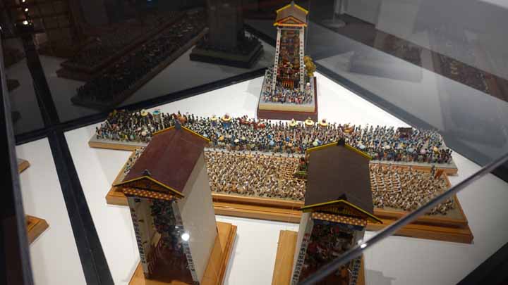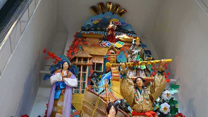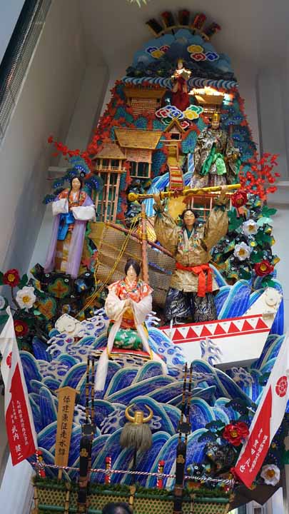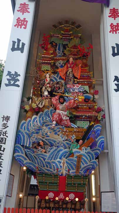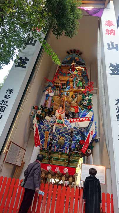 櫛田神社を参拝しここでも朱印を戴いた。この神社は7月に開催される博多祇園山笠のスタート地でもあり、テレビ局からの綺麗な山笠が大きく門前に展示してあった。