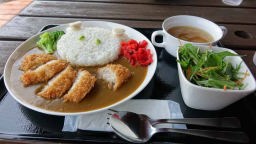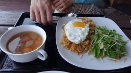 お昼近いので、城ケ崎を離れ、(午前11時40分、延284Km)ドライブイン「かえる家」のテラスで軽食でランチした。テラスでカツカレーとナシゴレンを食べている間、愛犬たちはマイベッドでおとなしく待ってくれていた。今日も暑い中愛犬たちはオツカレ気味なので、早いが宿に戻り休ませた。今回旅は犬中心なので仕方ないが、著名観光地をウロウロする場面はなく瞬間瞬間にカメラのシャッターを押すだけで観光した気分になっている。