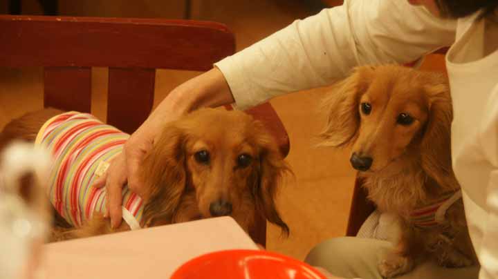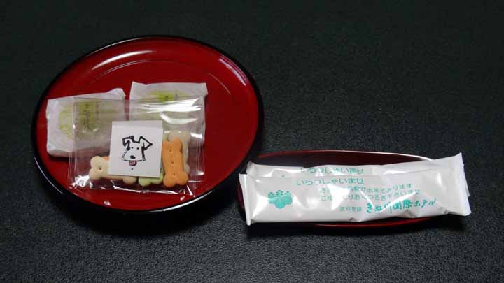 ホテルに入ると直ぐに愛犬との記念写真を宿の人が撮ってくれた。ラミエルウリエルを口頭で連絡したので、名前を少しばかり間違えたのには興ざめだったが、良いサービスだと思う。食堂も部屋も一緒の正に犬同伴ツアーである。犬のおやつが人間のお菓子の上に置いてある。ドッグランも2箇所、犬のお風呂も家族風呂(有料)もあった。