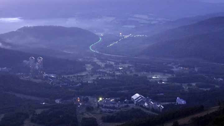 4時15分出発のホテルエリア内循環バスでゴンドラ乗り場まで向かい、標高591mの駅から1081mの頂上駅まで4人乗りのゴンドラに乗る。とても混雑している。連休の二日目中日だからだろうか。頂上はそこそこ広いので混雑していてもそう不自由はないのだが、問題は寒さ。長袖とウィンドブレーカーは用意してきたがそれでも冷えるので頂上駅売店で貸し出し用ジャンパーを借りた。