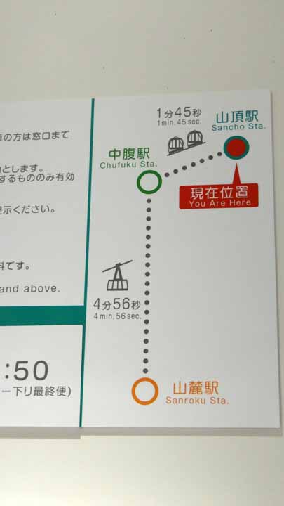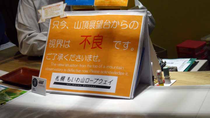 17時半、ホテルを出て藻岩山展望台から夜景を観に行くことにした。市電の山鼻9条駅からロープウェイ入り口まで乗ってそこから無料シャトルバスでロープウェイ改札(山麓駅)まで運んでくれる。ロープウェイでまず中腹駅まで乗り、そこから山頂駅まではモーリスカーで山頂駅まで行く。残念ながら入り口でもその旨説明は受けたのだが今日は中腹駅の手前で視界不良となり、中腹駅でも山頂駅でも全く下界は霞がかかって全く見えない。辛うじて見えたのは乗り場から中腹駅まで登る僅かな時間だけだった。残念だったが朝から天候不良なので仕方がない。