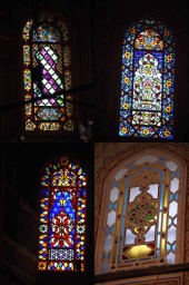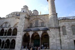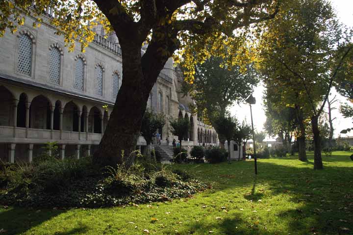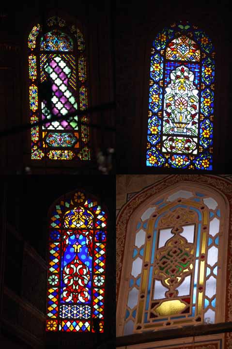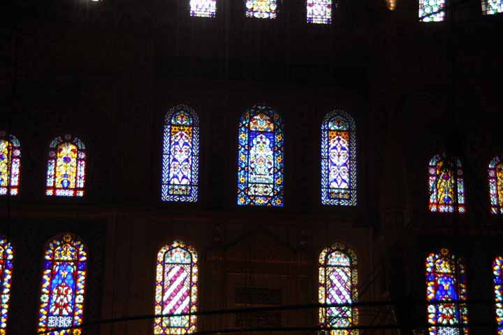 イスラム信徒の聖地はメッカであるが、イスタンブールではブルーモスクが国の聖堂として毎日観光客や信徒で賑わっている。聖堂内も観光客用には全面積の1/3しか与えられてなく、1日5回の礼拝時には、2/3部分が信徒で埋まるそうだ。ブルーモスクという名で親しまれてはいるが、鉛筆型のミュレットを6本も持つトルコの代表的寺院の名は『スルタンアフメット・ジャーミィ』と言う。ドームの200を超える窓から差し込む光が館内を淡くブルーに染めるのでこの名がある。絨毯とステンドグラス、大理石で作られた荘厳なオスマン朝建築物だ。この大聖堂の入場料は無料だが、出た所には寄付の受付場所がある。ここで寄付をすると『La Mosquee』というパンフ雑誌が貰える。上の写真はその雑誌に記載されている聖堂内の写真だ。