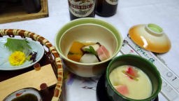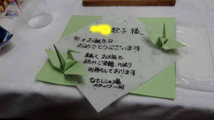 夕食は事前に頼んでおいた、愛子婆さんの姉の91歳の誕生日にあたるので、「バースディカード」と全員にソフトドリンクを旅館から振るまわれた。とっても、喜んでくれた。