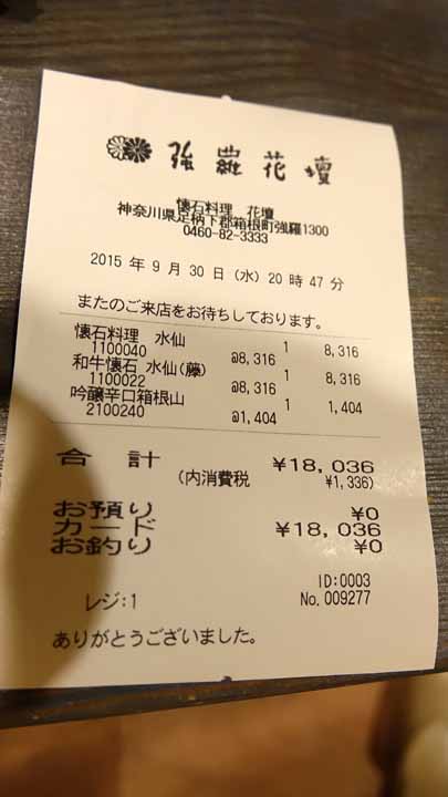 2015年9月30日(水)、強羅にて、強羅公園と彫刻の森美術館に行って、印象深い高級割烹「花壇」で夕食を食べました。