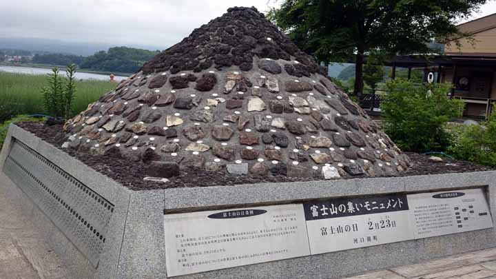 「日本の象徴でもある富士山を守り後世へ伝えるために、2月23日を富士山の日と制定、活動し守っていく。全国各地の○○富士の石を集めてこのモニュメントを作った」とのこと。北海道蝦夷富士から沖縄県本部富士まで、現在252個の石が埋め込まれている。はかまの部分には252の○○富士の名前が全部記載されている。