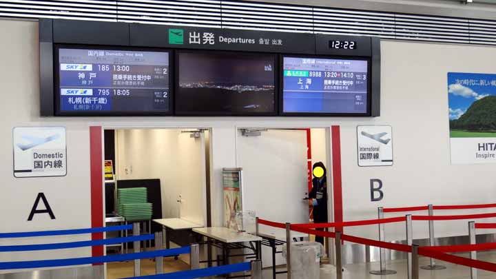 ANAと春秋航空が少しは飛んでるようだが、メインのスカイマークは札幌と神戸の1往復のみだ。昼御飯はレストランが無く、和洋中フードコートが1店あるだけ……。お昼はチャーシュー丼蕎麦セットにした。