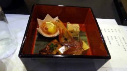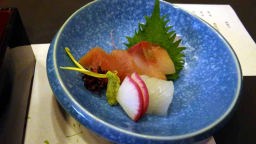 酒代を入れても2万円を切る旅館代だが、酒の肴やつまみは十分に満足できた。晩秋の前菜盛りの季節感溢れる料理からはじまり、酒盛りはそこそこ盛り上がった。刺身のなかに「横輪」という魚があった。きいてみると「黒(本)まぐろの幼魚」とのこと。関東では「メジ」と呼ばれているそうだ。