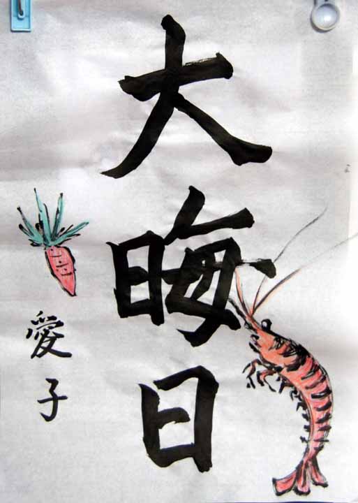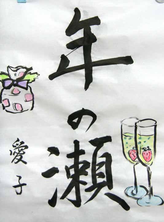 愛子様は2009年から近所のディサービスに10:00頃から15:30頃までお世話になるようになった。水曜日には、絵つきの習字をかけるのを楽しみにしています。2009年に手習いした一部です。