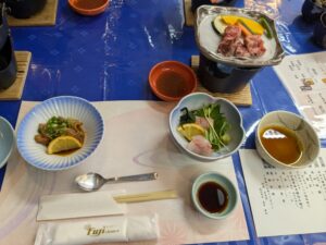 午後6時半より夕食。食事のメニューは申し分無かったが、今夜は飲み放題付き。ツレアイは梅酒のみだったが、dachs飼主は生中2杯、焼酎飫肥杉と田吾作、日本酒2杯他を楽しめた。豊後牛やリュウキュウが記憶に残った。帰りにはロビー向いに焼酎無料バーがあって西の関をロックで飲んできた。