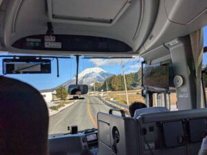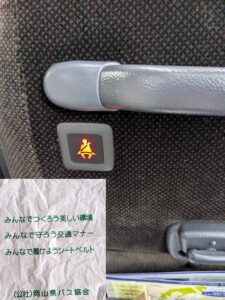 最近のツアーバスはだんだん豪華になっている。大型テレビ、トイレ付に加え、充電用USB、Wi-Fi接続が増えてきている。今回岡山桃太郎空港から3日間お世話になった下電観光バスの車内にはシートベルト着用ランプが前席についていた。ガイドや運転手がシートベルト着用をお願いしてもつけない人がいるので、着けてない人の前席シートにランプが点燈する仕組みでよく考えられていると思った。