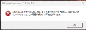 昨年末に購入した一体型デスクトップで4,5日前から立ち上げ時にシステムエラーが毎回出るようになった。NPSpeedHost.exeで「mfc140u.dllが無い」と表示されるエラーで、OK釦をタップすれば多分問題なく進んでいるのだが、気に懸かって仕方がないので今朝調べてみた。該当アプリはシステム初期化しないとインストールできないようで、これは困ったと1から検索調査探求した。