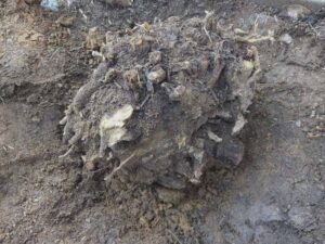 海棠と南天の株や根を根腐れさせようと様々な処置をして1年待った。殆ど腐っているだろうと思って南天にかぶせていた防草シートを外してみたら、殆どの根がご覧のように腐ってなかった。腐葉土に十分水分を与えなかったので根が腐らなかったのだろうと思う。
