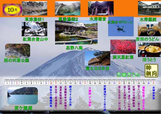 2021年10月のダイアリ ------------------------------------- 10 草抜きで腰痛再発 11 高崎長谷寺参拝後、草津温泉に向かう 12 雨模様の中、西の河原温泉など散策 13 水澤観音参拝後、無事帰宅 14 テニス仲間3人と銀次宴会 18 ツレアイ大腸肺がん検診 21 病院仲間3人と武蔵浦和宴会 24 富士山五合目を登って河口湖へ 25 雨の富士五湖をドライブ徘徊 26 紅葉台ハイク、道志から山中湖へ 27 山中湖畔散策 28 パノラマ台絶景から宮ケ瀬ダム経由し帰宅 29 ツレアイ体操会 31 東祥寺坐禅会参加 ------------------------------------- |