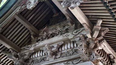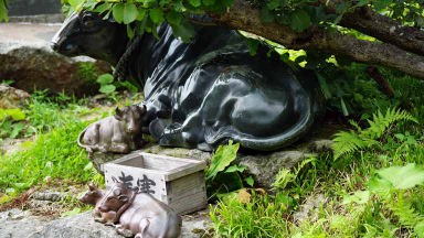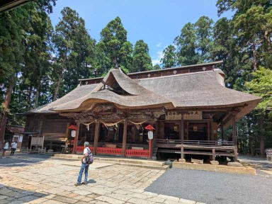 東北の伊勢とも言われ、和歌山県の熊野三山、長野県の熊野皇大神社とともに日本三熊野の一つに数えられる熊野大社。縁結びで有名。参道の入口には大鳥居、参道には樹齢850年の大イチョウも今力強くそびえ立っていた。46段の石段をのぼると現れる、どっしりした風格のある茅葺きの本殿。風鈴の小径に足元シャワーが涼しかった。本殿裏側の「三羽のうさぎ」の彫刻をすべて見つけると願いが叶うとか。ガイドさんにヒントは貰ったがハッキリと認識は難しい。
