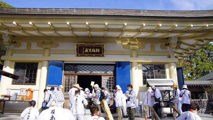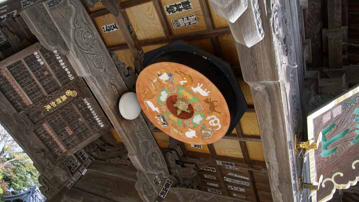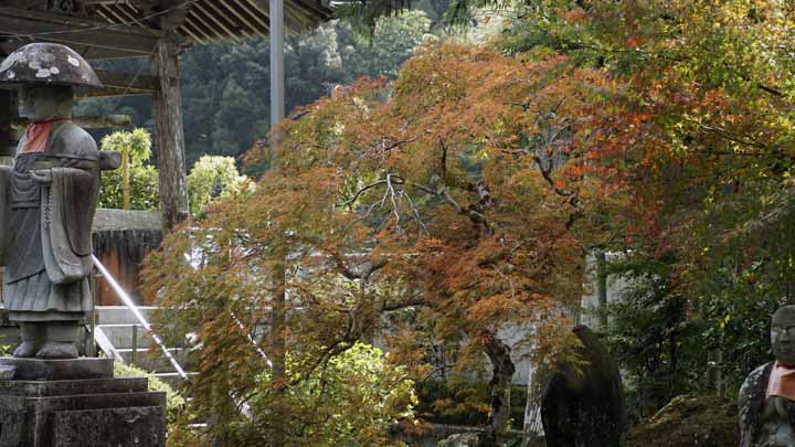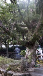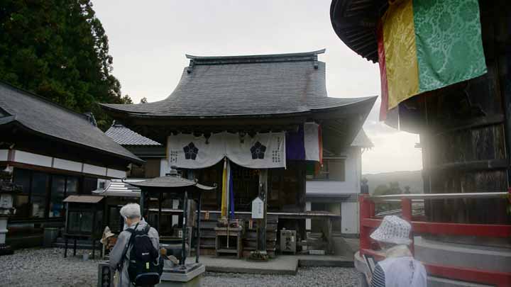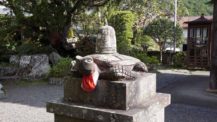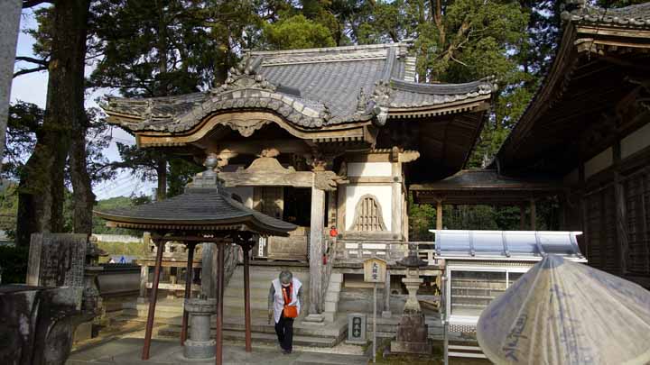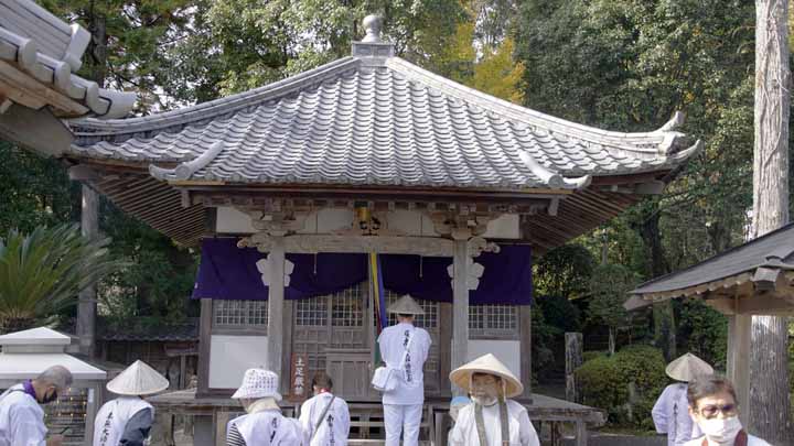 7時15分に出発し、最初の目的の寺は42番佛木寺。今日は高速道路などを使い、バスの長旅になり、6ヶ寺を巡る予定。7時35分に佛木寺に到着。ここは、「牛の背に乗る大師様」伝説から、ペット供養で信仰を集めている。参拝後、8時に出発し、すぐ近くの41番龍光寺に移動した。かつては神仏習合の巣味であったので赤い鳥居や狛犬などがまだ残っている。8時40分に出発し、愛媛県最後の霊場40番観自在寺に向かうが、長い時間バスに乗るので、道の駅でトイレ休憩。