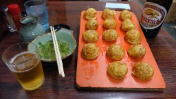 明石駅のたぬき像ポンタ前で午後4時に友人と待ち合わせる予定になっていたのだが、3時過ぎに到着してしまったので、魚の棚商店街で名物の「たまご焼き」を食べてきた。ソースをかけずにタレにつける所謂「明石焼き」である。具は蛸ではなく、大好きな穴子をセレクトした。瓶ビールとも相性が良いし、柔らかくて歯触りが良い。友人とは喫茶店でつかの間だったが少し近況を話し合って、お土産に友人お手製のイカナゴくぎ煮を戴いてきた。帰ったらさっそくいただきたい。クルミが入っているのは珍しい。