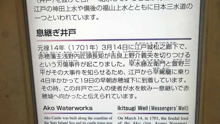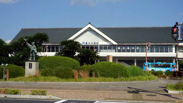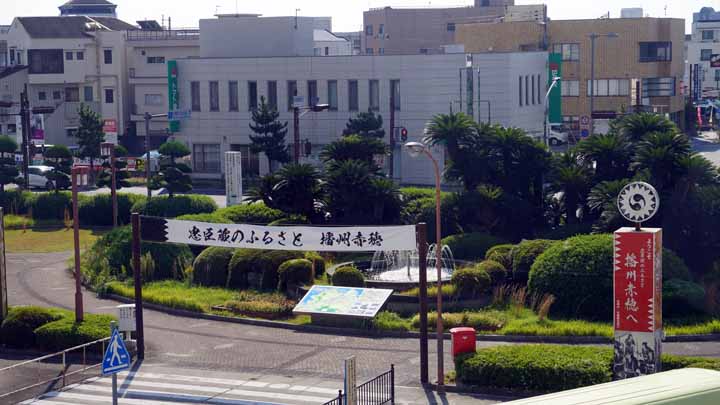 今日の赤穂観光のターゲットはどこまで行けるか疑問だが息継ぎ井戸、花岳寺、大石神社、大石邸長屋門、赤穂城跡、午後はバスで御崎へ伊和都比売神社、きらきら坂を巡りたい。姫路駅9時40分発の4両連結電車は各駅停車。途中新幹線停車駅相生で山陽線から赤穂線に切り替えがあるが、姫路からの駅数は僅か7駅なので特に遠いとは感じないだろう。赤穂駅には10時12に到着した。駅の観光案内所で名所を聞いて、地図、バス時刻表、1日バス乗り放題券500円を買った上、駅前から大石神社方面に向かう。