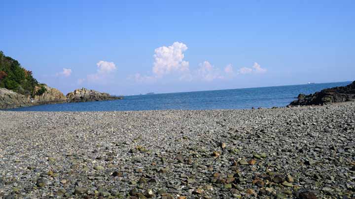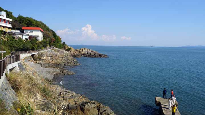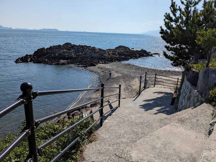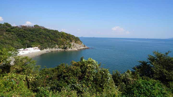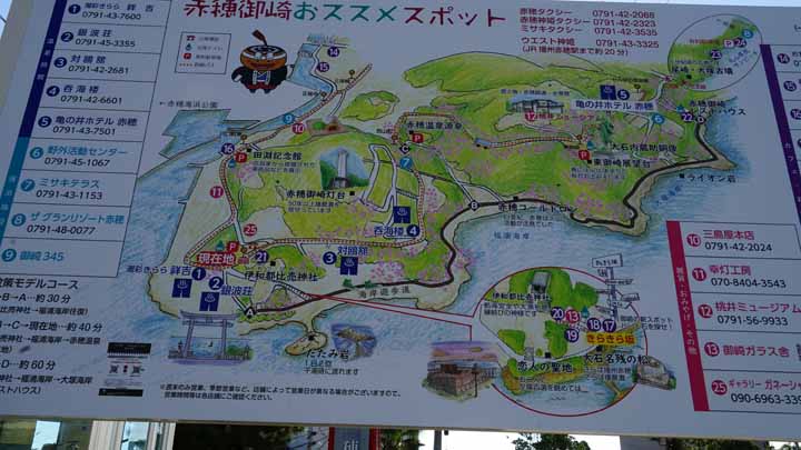先ずは息継ぎ井戸から花岳寺で参拝後、赤穂城址に入る。花岳寺に「大石名残の松」があったが、御崎のきらきら坂の下にも「大石名残の松」があった。城内には入れず、石垣のみを見る散策だがとにかく広かった。途中大石神社で四十七士の石像を見て、御朱印も頂く。大石邸長屋門だけは見逃したが、12時前にバス停おおいし神社東門に着いた。信号待ちの間に12時丁度のバスは行き過ぎてしまった。30分待って御崎行のバスに乗れた。12時45分には御崎に着いて、伊和都比売神社にまず参拝した。キラキラしていない細くて貧相なきらきら坂を降りるとすぐそこは海。引き潮だったので、たたみ岩まで登れ、海水もさわれた。