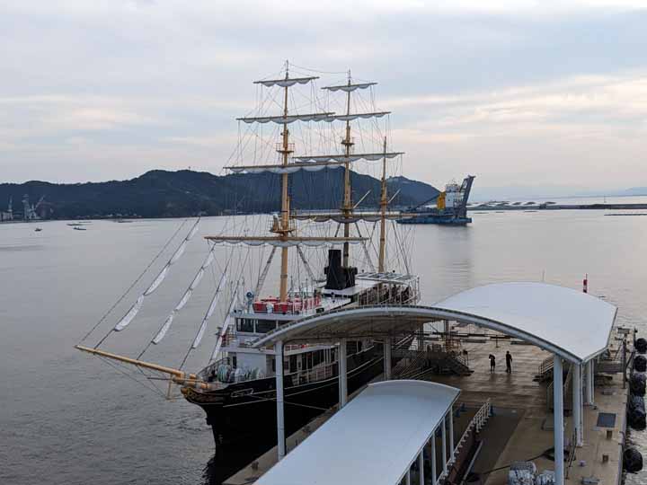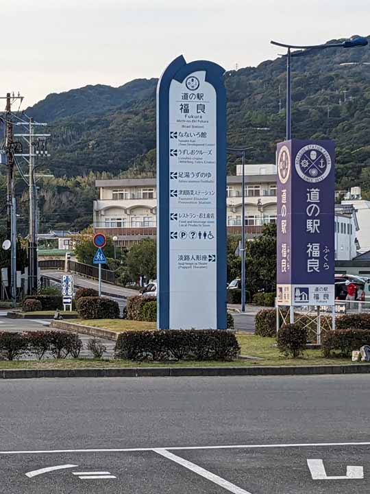 宿に着く前に「道の駅福良」に16時前に寄った。ここから渦潮観潮船もでており、淡路特有の人形芝居の舞台もあった。シーガイヤ海月の白いAWAJIの文字はここにもあった。