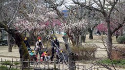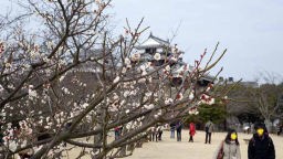 お風呂上がりには紅梅・白梅が散り際の道後公園を歩いた。展望台からは遠く石鎚山らしき山々も見渡せた。