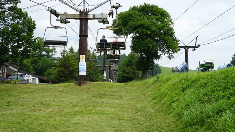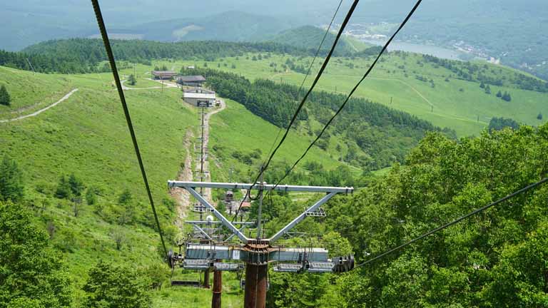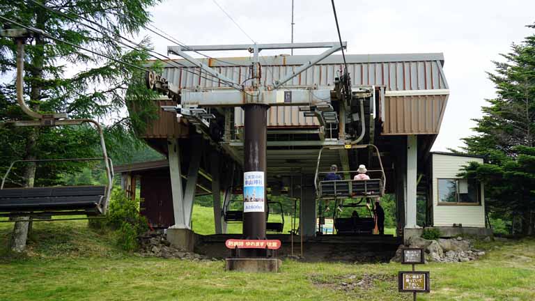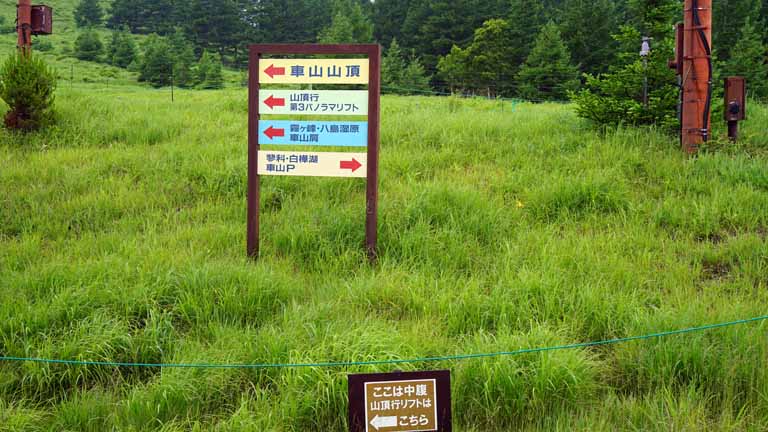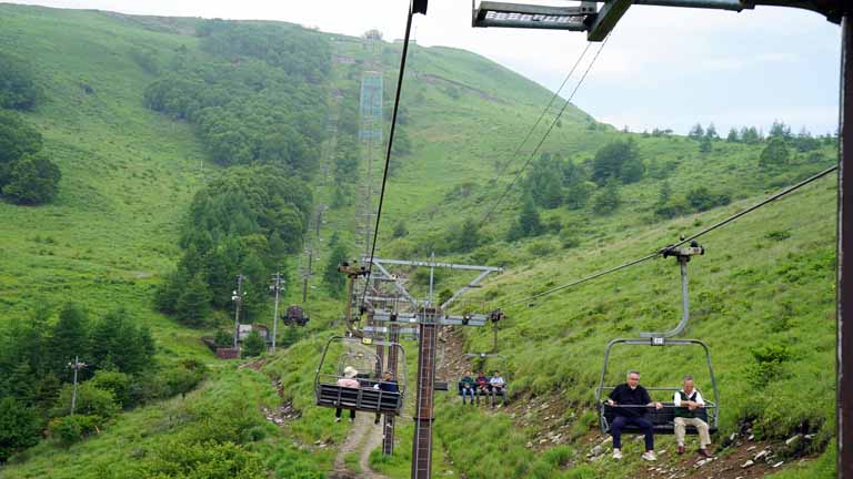 10時発のバスでリフト乗り場まで数分。リフトは中腹までで一旦おりて、別のリフトに乗り換え、1900m強の山頂までさらに登る。霧ヶ峰の主峰「車山」山頂まで合計乗車時間は約15分、高低差は350mとのこと。