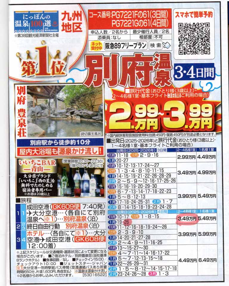 今回旅はツアー企画だが、成田空から大分空港までの往復交通費と旅館「豊泉荘」の3泊宿泊費用だけしか入っていないので、個人旅と内容的には同じだ。