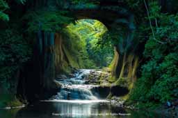 清水渓流広場(濃溝の滝・亀岩の洞窟)は、洞窟に差し込む朝日がスポットライトのように岩肌と川面を照らし、ハートの形を作り出す幻想的なスポットで人気を集めている。- 千葉県 君津市 笹