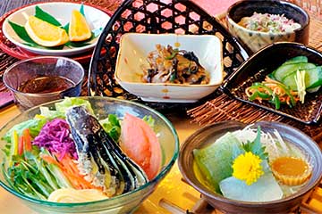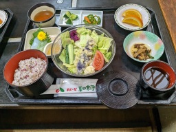 12時に沼田ICを出て、原田農園には12時10分到着。2階の和食堂でサラダうどん中心の和膳をいただいた。