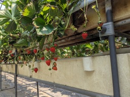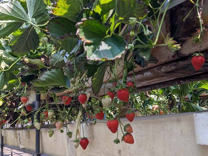 12時55分に食事を終え、すぐ近くの温室に行って苺狩り。銘柄は静岡で食べたものとおなじ「かおりの」。収穫が終わりの時期と思っていたが、たくさん食べられた。それでも農園の方の話によると6月10日苺狩りは閉園とのこと。売店では多くのいちごが販売されていた。