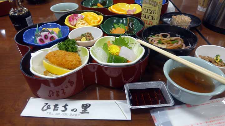 ここから約1時間、水戸に向かった。11時45分,常磐道土浦北ICから水戸ICに12時15分、その後近くの水戸ドライブインひたちの里で13時25分まで昼食「水戸葵御膳」&御土産購入勧誘タイ厶。ナニも買わなかったが昼食にも入っていた必要のなき水戸納豆を御土産として全員に配っていたので貰うしかなかった。