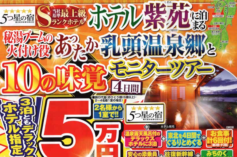 昨年の愛犬親子の度重なる不幸から歳を越し、「これからは、いろいろと旅を楽しもう」とツレアイと決意し、今回は阪急交通社Trapicsの勧めで『ホテル紫苑に泊まる(3泊目)秘湯ブームの火付け役あったか乳頭温泉郷と10の味覚モニターツアー四日間』に参加してきた。